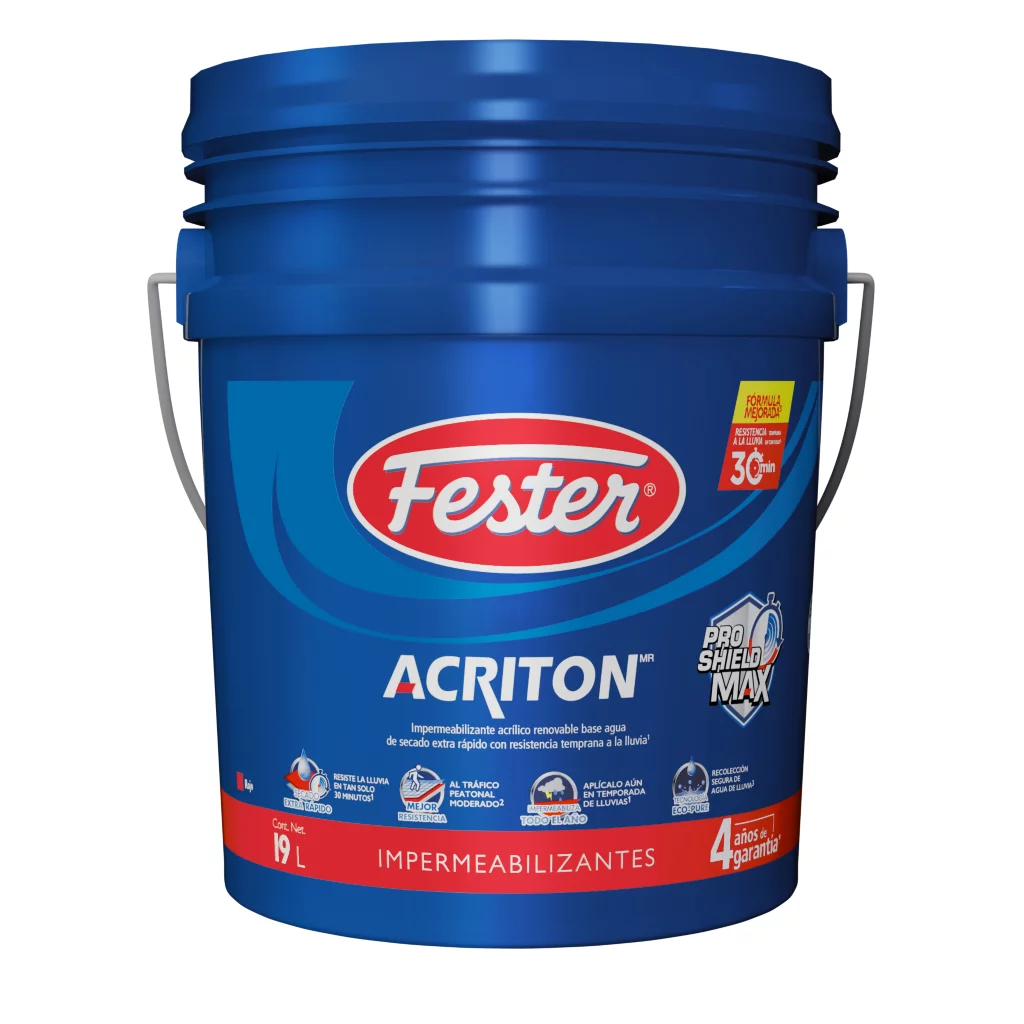 FESTER® ACRITON PROSHIELD MAX 4 AÑOS es un impermeabilizante elastomérico de última generación que logra el mejor balance de propiedades mecánicas como son: la elongación, tensión y resistencia al desgaste; además de secado extra rápido, dando ventajas únicas en el mercado para poder hacer la impermeabilización completa en una mañana y ofrecer la mayor durabilidad.