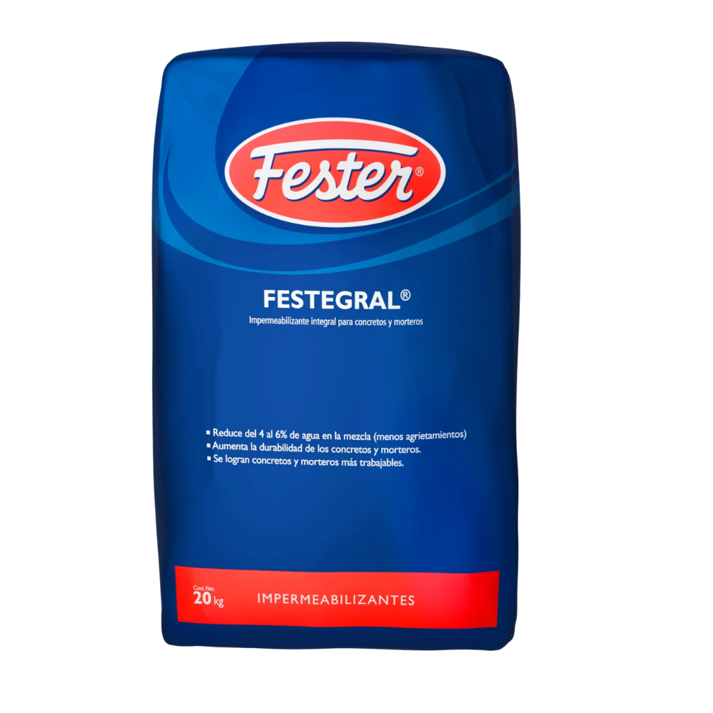 Aditivo para concreto en polvo que mejora la impermeabilidad del concreto sin afectar su resistencia estructural FESTER® FESTEGRAL es un impermeabilizante en polvo que se incorpora directamente en la mezcla de concreto o mortero para reducir su permeabilidad sin comprometer la resistencia a la compresión. Su fórmula contiene sales de ácidos grasos que actúan como repelente al paso del agua, evitando filtraciones por capilaridad o presión hidrostática ligera.