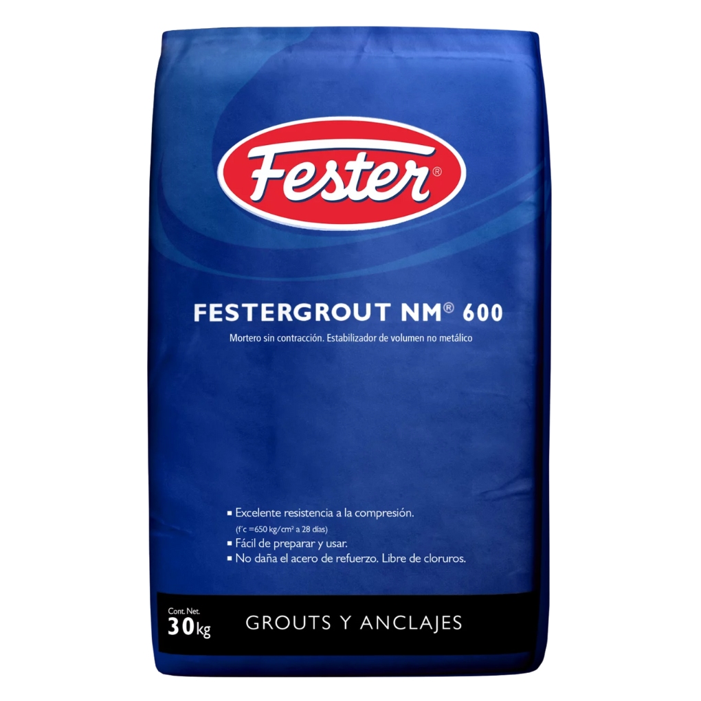 Mortero especializado para anclar, resanar, asentar o nivelar FESTERGROUT® NM 600 es un producto químico en polvo a base de cemento Pórtland, agregados minerales y aditivos que al mezclarse con agua produce un mortero sin contracciones, de alta resistencia a la compresión (625 Kg./cm² a 28 días) y buena fluidez. Para anclar, para resanar superficies de concreto, asentar y nivelar maquinaria pesada con poca y nula vibración. Libre de contracción